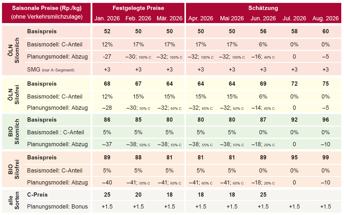 Die angegebenen Milchpreise sind saisonale Basispreise. Effektiv ausbezahlte Preise enthalten Zu-/Abschläge gemäss Einkaufskonditionen.