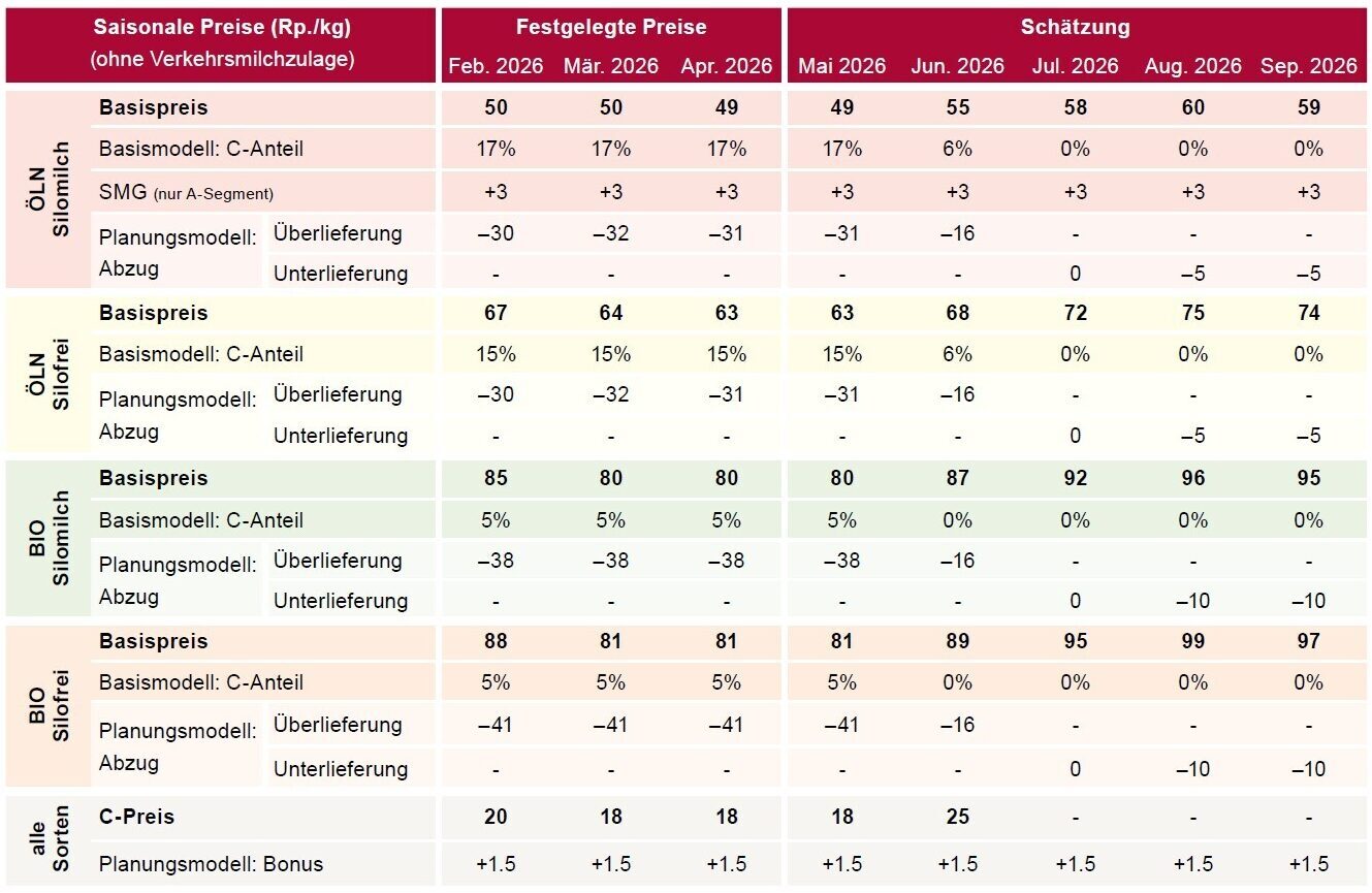 Die angegebenen Milchpreise sind saisonale Basispreise. Effektiv ausbezahlte Preise enthalten Zu-/Abschläge gemäss Einkaufskonditionen.