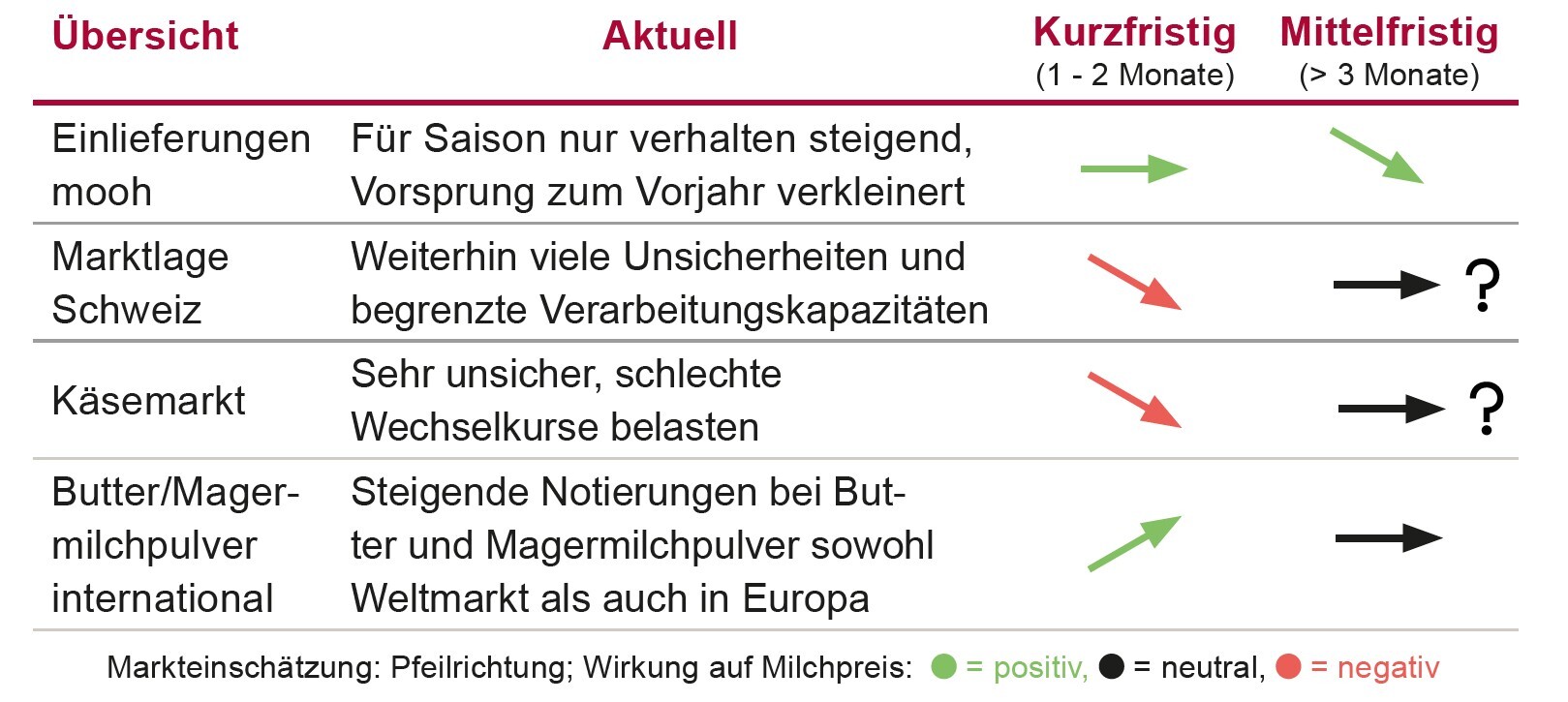 Erfreulicherweise scheinen sich die Preise für Butter und Milchpulver auf den Weltmärkten zu erholen. Der Global Dairy Trade legte Anfang März um +5,7 % zu, Magermilchpulver sogar um +9,1 %. Auch in Europa steigen die Notierungen; der Kieler Rohstoffwert lag im Februar wieder deutlich über 30 cts. Der Tiefpunkt scheint damit überstanden. Anders entwickeln sich jedoch die Produzentenpreise in Europa, die weiter Richtung 40 cts. sinken. Aufgrund der grossen Milchmengen stehen auch die Spotmilchpreise unter Druck; in Deutschland wurde Vollmilch zuletzt für rund 15 cts. gehandelt. Die Marktlage bleibt widersprüchlich: Butter ist gesucht, während Magermilch teilweise in Biogasanlagen verwertet wird, weil Verarbeitungskapazitäten fehlen. Die steigenden Fett- und Butterpreise sind für uns dennoch positiv, da sie zumindest die Währungsverluste bei Rahmund Butterexporten ausgleichen.