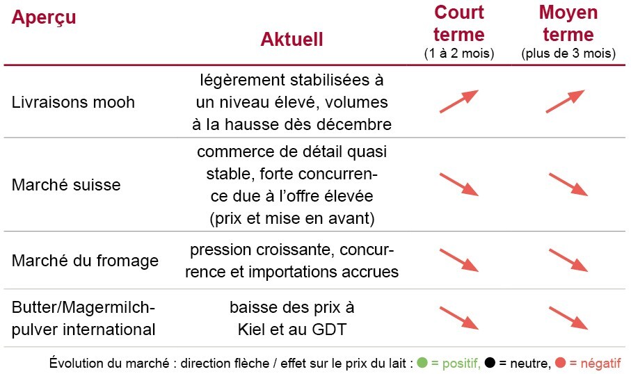 Les livraisons de lait à mooh en octobre ont été supérieures de +5,1 % à celles de l’année précédente. En novembre, les volumes restent pour l’instant stables à un niveau très élevé, avant la traditionnelle hausse saisonnière de décembre au printemps. Dans l’ensemble, nous prévoyons pour les prochains mois une augmentation d’environ 5 % par rapport à l‘année précédente. La période des Fêtes s’annonce donc comme un défi : bien que les capacités de transformation soient à nouveau largement disponibles après les révisions, les productions de Noël seront déjà terminées – alors que les marchés sont saturés. L’évolution positive vient du commerce de détail suisse, qui continue de bien fonctionner et maintient une demande stable pour les produits nationaux.