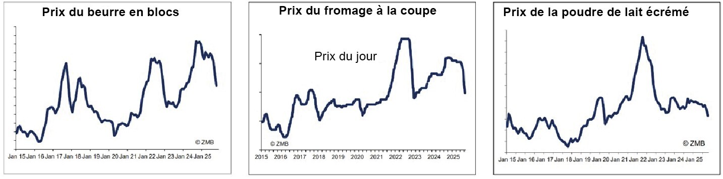 La baisse des prix est actuellement particulièrement marquée dans l’Union européenne, en raison notamment d’un volume très élevé des livraisons de lait à travers toute l’Europe. Ces volumes supplémentaires ne trouvent pas preneur sur les marchés habituels. En Allemagne, par exemple, le lait peut être acheté sur le marché spot à un peu plus de 30 centimes. Transformé en fromage et en beurre, ce lait bon marché entraîne des prix extrêmement bas pour ces produits, ce qui provoque un effondrement général des prix du beurre et du fromage. En conséquence, le prix du lait payé aux producteur·trice·s dans l’UE devrait chuter massivement dans les mois à venir. La baisse du prix LTO de -1,29 ct entre août et septembre n’est probablement qu’un début. De manière générale, les prévisions pour début 2026 tablent sur des prix producteurs nettement inférieurs à 50 centimes.