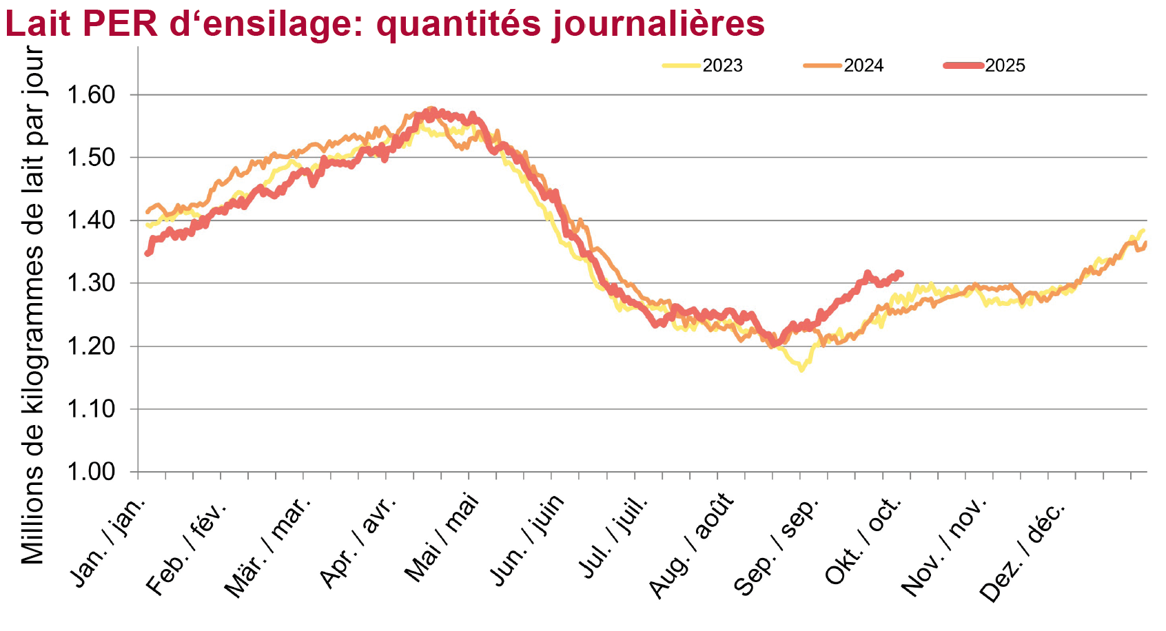 Les évolutions défavorables du marché au cours des dernières semaines nécessitent une réduction claire des prix. Pour le lait ensilage PER, le prix baisse de 4 ct/kg par rapport à la prévision, pour s’établir à 56 ct/kg. Les prix des autres catégories de lait ont également dû être ajustés à la baisse, car les volumes sont élevés et les quantités éventuellement déclassées aboutissent dans le segment du lait ensilage PER, où il n’existe actuellement aucun débouché. Le conseil d’administration a en outre décidé de refléter la situation du marché dans la déduction pour sur-livraison. Pour novembre, une déduction de –12 ct/kg a d’ores et déjà été fixée. Cette déduction ne reflète pas complètement la situation actuelle – elle devrait en réalité être encore plus élevée. Cependant, mooh ayant jusqu’ici appliqué un modèle prévoyant une déduction maximale de –12 ct/kg, nous souhaitons maintenir cette limite pour des raisons de continuité jusqu‘à fin 2025. En 2026, notamment pendant les mois printaniers à forte production, une part importante des volumes excédentaires devrait être classée en lait C, ce qui entraînera une déduction supérieure à 12 ct/kg. Ainsi, à partir de 2026, la limite maximale de –12 ct/kg sera levée. Dès janvier 2026, une déduction plus élevée pourra être appliquée si nécessaire – selon les estimations actuelles, mooh commencera en janvier 2026 avec une déduction de –14 ct/kg pour les sur-livraisons.