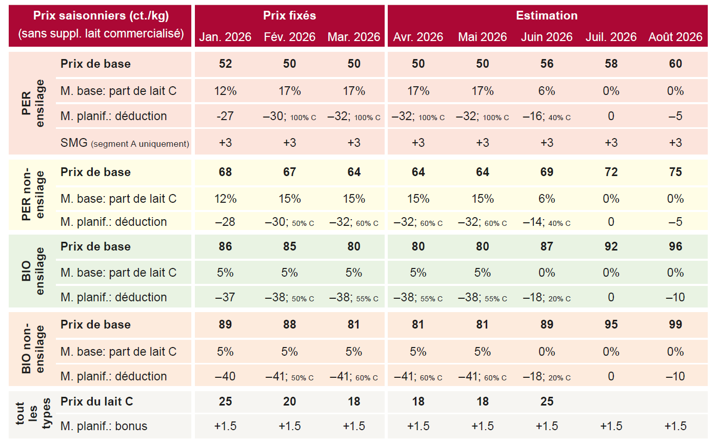 Déduction sur les surlivraisons entre novembre et juin ainsi que sur les sous-livraisons entre juillet et octobre; bonus de planification versé sur l’ensemble du volume de lait.