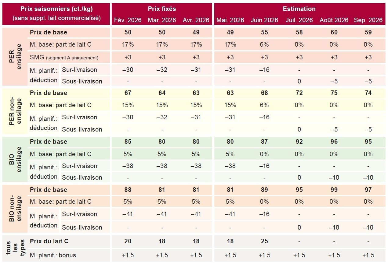 Déduction sur les sur-livraisons entre novembre et juin ainsi que sur les sous-livraisons entre juillet et octobre; bonus de planification versé sur l’ensemble du volume de lait.
