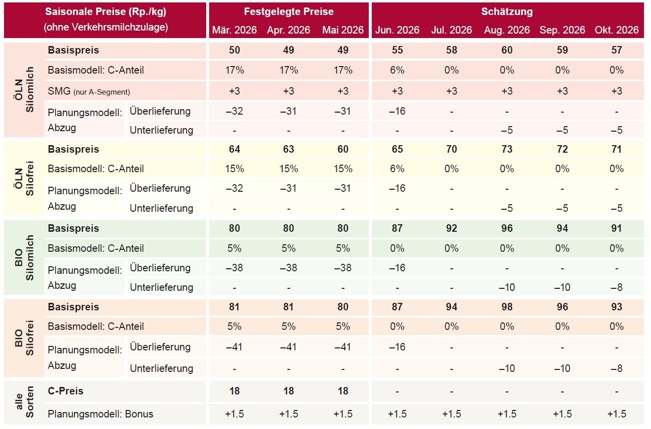 Die angegebenen Milchpreise sind saisonale Basispreise. Effektiv ausbezahlte Preise enthalten Zu-/Abschläge gemäss Einkaufskonditionen.