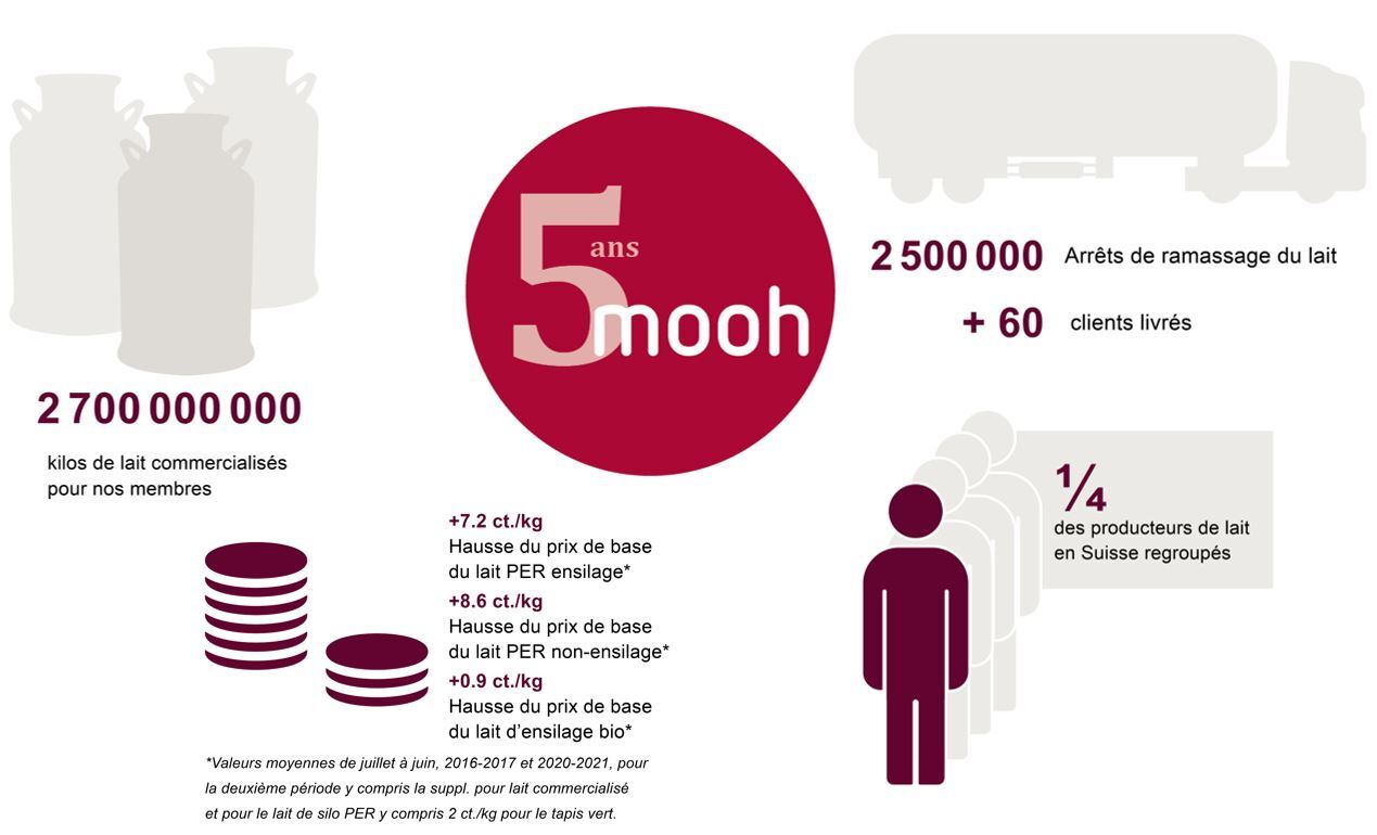 mooh société coopérative a fêté ses 5 ans en été 2021. L'association regroupant un quart de tous les producteurs de lait en Suisse peut fêter de nombreux succès malgré sa courte histoire. Notamment une augmentation respectable du prix du lait. Pour fêter cela, mooh a emmené ses clients dans l'étable et leur a montré tout le travail qui se cache derrière un litre de lait. Car ce n'est qu'en collaboration avec ses producteurs et ses clients que mooh peut atteindre ses objectifs. C’est dans cet esprit que le nouveau slogan a été présenté : mooh : le meilleur pour mon lait.