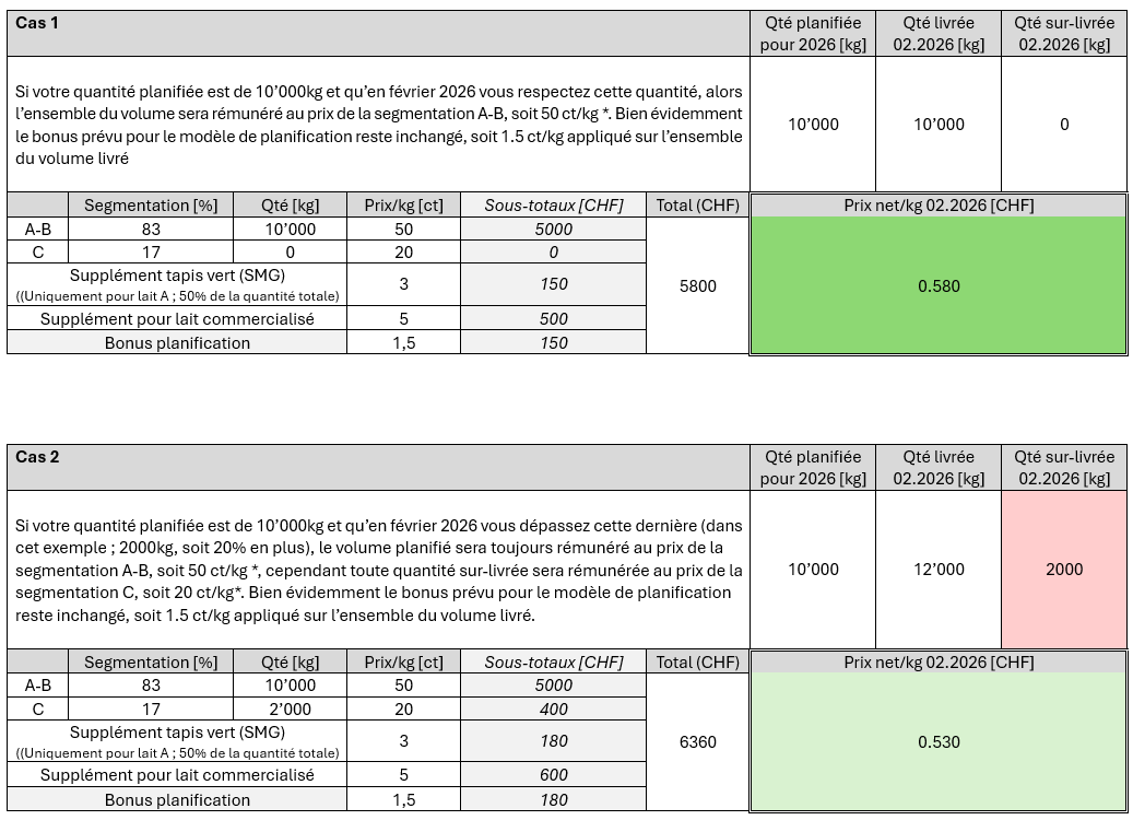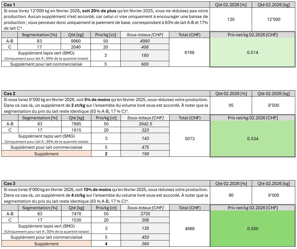 Dès février 2026, un système d’incitation à la baisse des volumes de production a été mis en place pour les exploitations ne participant pas au modèle de planification (modèle de base). Ce dernier permet de compenser en partie la dévalorisation liée au lait C.