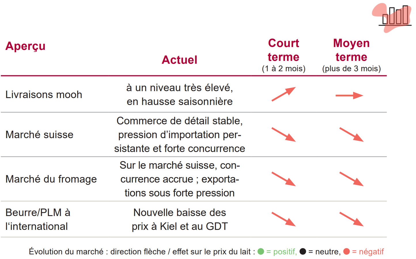 Depuis cet automne, les prix du lait réalisés par mooh sont nettement inférieurs aux prix indicatifs en raison de la situation actuelle du marché. L’écart croissant avec l’étranger a renforcé la pression à l’importation et entraîné des sous-enchères sur le marché intérieur. mooh a en outre perdu des parts protégées du marché A. Combinés à des livraisons bien supérieures aux volumes planifiés, ces éléments nous ont contraints, dès le quatrième trimestre 2025, à écouler d’importants volumes comme lait C et à exporter du lait B à des prix très bas, ce qui a fortement pesé sur les prix du lait. Le fait que des volumes de lait C déjà vendus en 2025 ne puissent être achetés auprès des producteur·trice·s qu’en 2026 mobilise en outre des liquidités. L’ensemble de ces facteurs nous oblige à procéder à une baisse douloureuse des prix du lait, en particulier pour le lait PER avec ensilage. Nous partons du principe que ces baisses reflètent déjà la baisse des prix indicatifs de l‘IP Lait, qui a été décidée lundi 15 décembre.